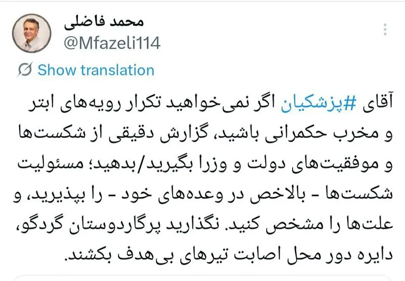 آقای پزشکیان اگر نمیخواهید تکرار رویههای ابتر و مخرب حکمرانی باشید، گزارش دقیقی از شکستها و موفقیتهای دولت و وزرا بگیرید/بدهید؛ مسئولیت شکستها – بالاخص در وعدههای خود – را بپذیرید، و علتها را مشخص کنید. نگذارید پرگاردوستان گردگو، دایره دور محل اصابت تیرهای بیهدف بکشند.