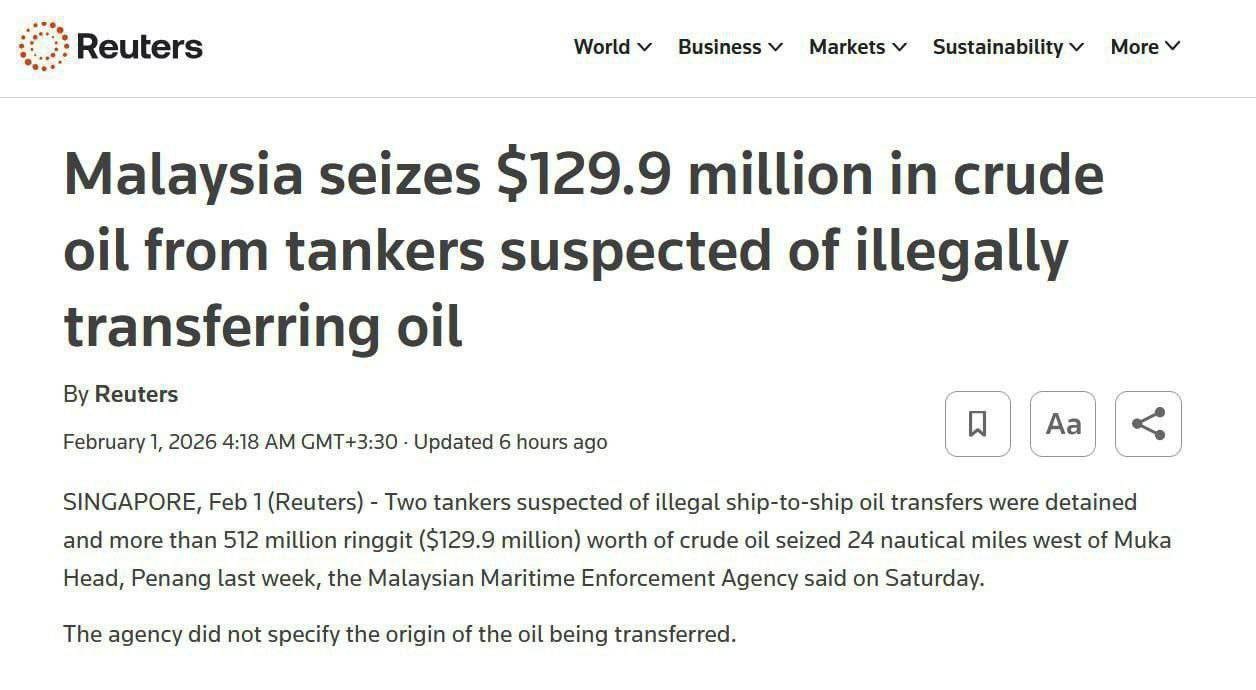 عصر ایران نوشت: رویترز در این مورد ادعا کرد که دو نفتکش ایرانی توسط مالزی توقیف شد ارزش نفت و نفتکش مجموعا ۳۱۰ میلیون دلار است.