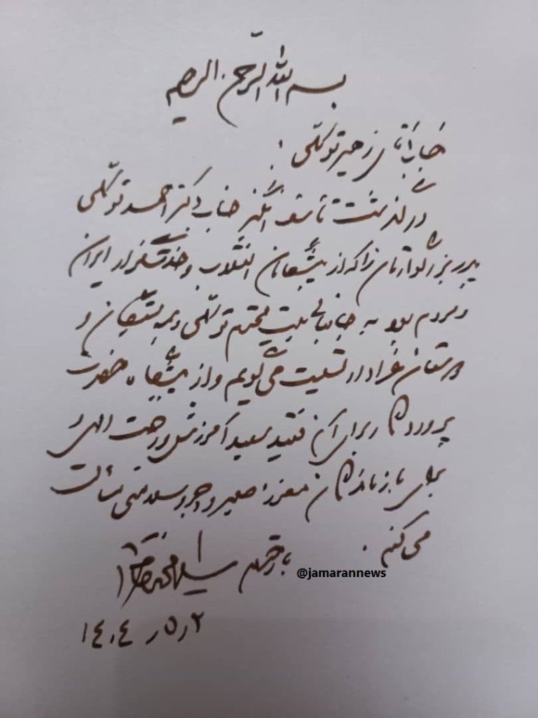درگذشت تاسف انگیز جناب دکتر احمد توکلی پدر بزرگوارتان را که از پیشگامان انقلاب و خدمتگزار ایران و مردم بود به جنابعالی، بیت محترم توکلی و همه بستگان و دوستان عزادار تسلیت می گویم و از پیشگاه حضرت پروردگار برای آن فقید سعید آمرزش و رحمت الهی و برای بازماندگان معزز صبر و اجر و سلامتی مسالت می کنم.