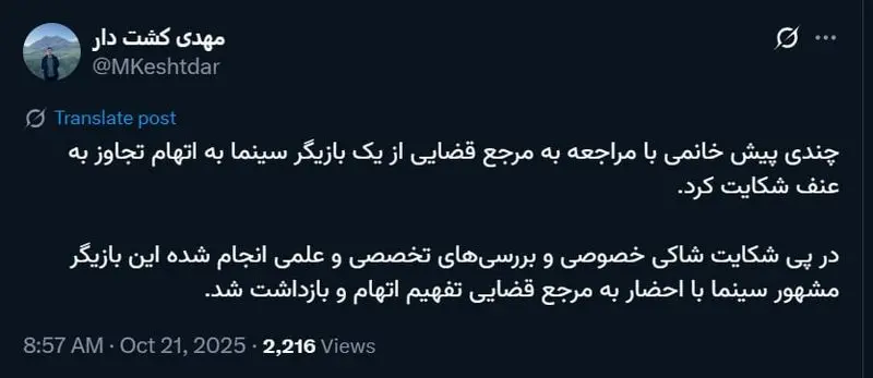 مهدی کشت دار، مدیرعامل خبرگزاری میزان، در حساب کاربری خو در شبکه اجتماعی ایکس نوشت: چندی پیش خانمی با مراجعه به مرجع قضایی از یک بازیگر سینما به اتهام تجاوز به عنف شکایت کرد. در پی شکایت شاکی خصوصی و بررسیهای تخصصی و علمی انجام شده این بازیگر مشهور سینما با احضار به مرجع قضایی تفهیم اتهام و بازداشت شد.
