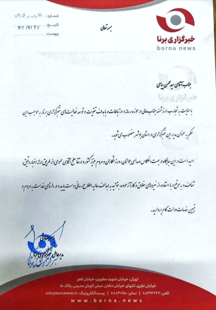 بوشهر ۲۴: با حکم مدیرعامل خبرگزاری برنا، سید محسن پیامی به‌عنوان مدیر این خبرگزاری در استان بوشهر منصوب شد.