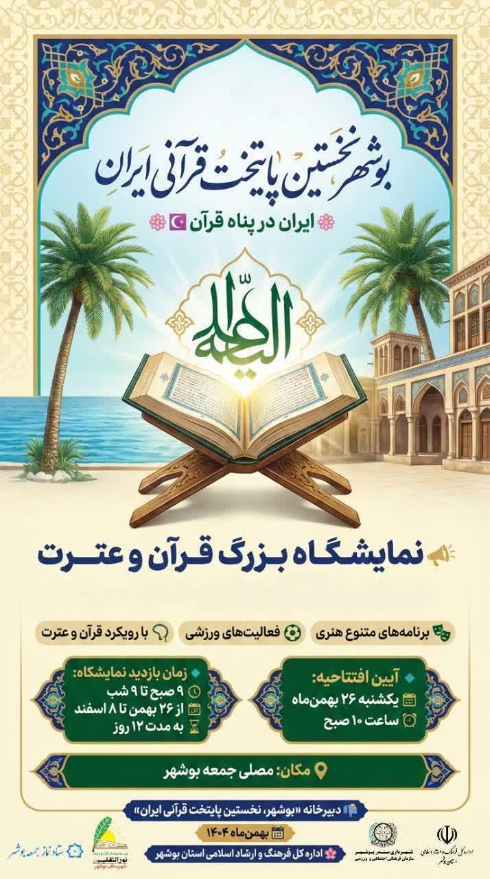 بوشهر ۲۴: نمایشگاه بزرگ قرآن، کتاب و محصولات فرهنگی و مذهبی استان بوشهر با شعار «ایران در پناه قرآن» با حضور مدیرکل دفتر ترویج و توسعه قرآن و عترت وزارت فرهنگ و ارشلامی و شماری از مسئولان استانی در جایگاه نماز جمعه بوشهر افتتاح شد.